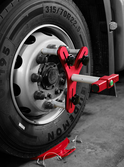 Для измерения грузовиков или полуприцепов с установленными на них легкосплавными колёсными дисками необходимо использовать специальные ножки. Входящие в базовую комплектацию магнитные ножки не подойдут. Специальные ножки монтируются и фиксируются на шпильку ступицы колеса. После монтажа на три шпильки к ним крепится колёсный адаптер с лазерной головкой.